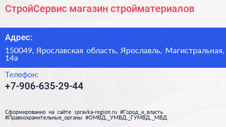 СтройСервис, магазин стройматериалов по адресу 150049, Ярославская область, Ярославль, Магистральная, 14а в дальнейшем Организация, размещена в следующих категориях: