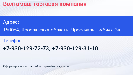 Волгамаш, торговая компания по адресу 150064, Ярославская область, Ярославль, Бабича, 3в в дальнейшем Организация, размещена в следующих категориях: