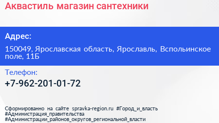 Аквастиль, магазин сантехники по адресу 150049, Ярославская область, Ярославль, Вспольинское поле, 11Б в дальнейшем Организация, размещена в следующих категориях: