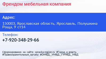 Френдом, мебельная компания по адресу 150003, Ярославская область, Ярославль, Полушкина Роща, 9 ст14 в дальнейшем Организация, размещена в следующих категориях: