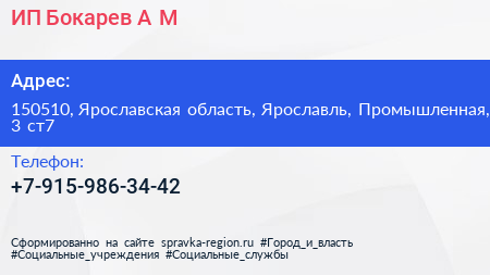 ИП Бокарев А.М. по адресу 150510, Ярославская область, Ярославль, Промышленная, 3 ст7 в дальнейшем Организация, размещена в следующих категориях:
