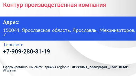 Контур, производственная компания по адресу 150044, Ярославская область, Ярославль, Механизаторов, 7 в дальнейшем Организация, размещена в следующих категориях: