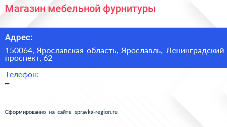 Магазин мебельной фурнитуры по адресу 150064, Ярославская область, Ярославль, Ленинградский проспект, 62 в дальнейшем Организация, размещена в следующих категориях:
