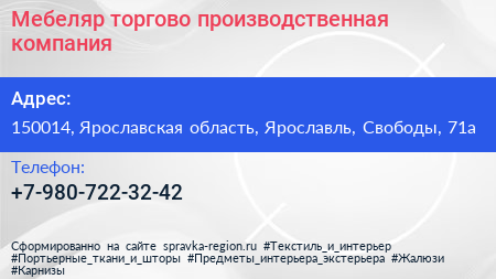 Мебеляр, торгово-производственная компания по адресу 150014, Ярославская область, Ярославль, Свободы, 71а в дальнейшем Организация, размещена в следующих категориях: