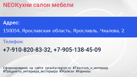 NEOКухни, салон мебели по адресу 150054, Ярославская область, Ярославль, Чкалова, 2 в дальнейшем Организация, размещена в следующих категориях: