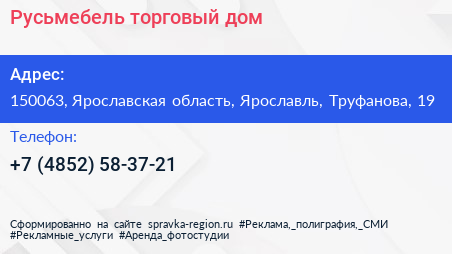 Русьмебель, торговый дом по адресу 150063, Ярославская область, Ярославль, Труфанова, 19 в дальнейшем Организация, размещена в следующих категориях: