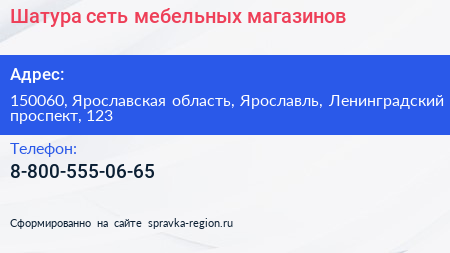 Шатура, сеть мебельных магазинов по адресу 150060, Ярославская область, Ярославль, Ленинградский проспект, 123 в дальнейшем Организация, размещена в следующих категориях: