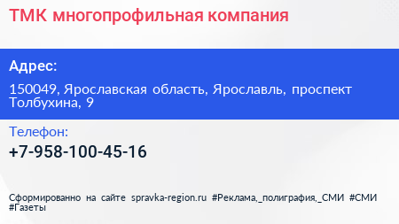 ТМК, многопрофильная компания по адресу 150049, Ярославская область, Ярославль, проспект Толбухина, 9 в дальнейшем Организация, размещена в следующих категориях: