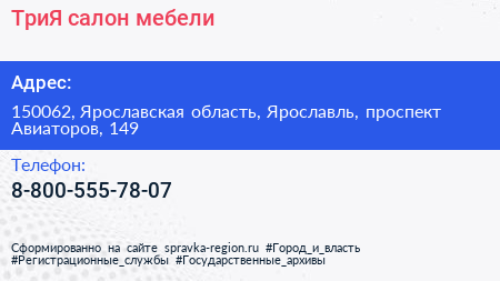ТриЯ, салон мебели по адресу 150062, Ярославская область, Ярославль, проспект Авиаторов, 149 в дальнейшем Организация, размещена в следующих категориях: