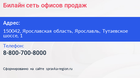 Билайн, сеть офисов продаж по адресу 150042, Ярославская область, Ярославль, Тутаевское шоссе, 1 в дальнейшем Организация, размещена в следующих категориях: