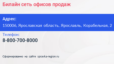 Билайн, сеть офисов продаж по адресу 150006, Ярославская область, Ярославль, Корабельная, 2 в дальнейшем Организация, размещена в следующих категориях: