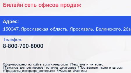 Билайн, сеть офисов продаж по адресу 150047, Ярославская область, Ярославль, Белинского, 26а в дальнейшем Организация, размещена в следующих категориях: