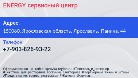 ENERGY, сервисный центр по адресу 150060, Ярославская область, Ярославль, Панина, 44 в дальнейшем Организация, размещена в следующих категориях: