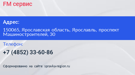 FM-сервис по адресу 150065, Ярославская область, Ярославль, проспект Машиностроителей, 30 в дальнейшем Организация, размещена в следующих категориях: