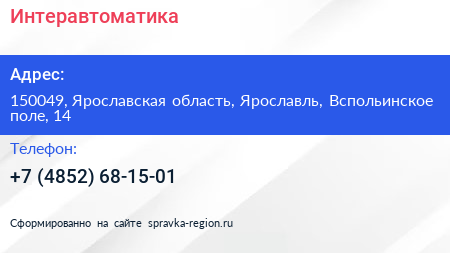 Интеравтоматика по адресу 150049, Ярославская область, Ярославль, Вспольинское поле, 14 в дальнейшем Организация, размещена в следующих категориях: