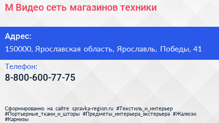 М.Видео, сеть магазинов техники по адресу 150000, Ярославская область, Ярославль, Победы, 41 в дальнейшем Организация, размещена в следующих категориях: