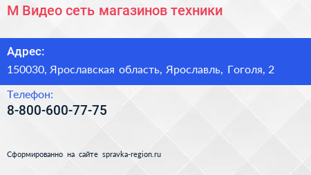М.Видео, сеть магазинов техники по адресу 150030, Ярославская область, Ярославль, Гоголя, 2 в дальнейшем Организация, размещена в следующих категориях: