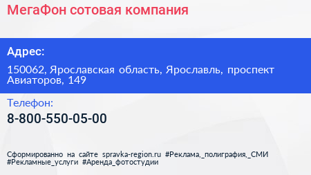 МегаФон, сотовая компания по адресу 150062, Ярославская область, Ярославль, проспект Авиаторов, 149 в дальнейшем Организация, размещена в следующих категориях: