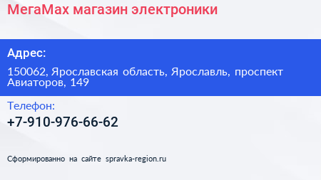 МегаMax, магазин электроники по адресу 150062, Ярославская область, Ярославль, проспект Авиаторов, 149 в дальнейшем Организация, размещена в следующих категориях: