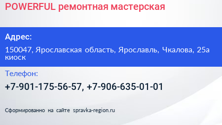 POWERFUL, ремонтная мастерская по адресу 150047, Ярославская область, Ярославль, Чкалова, 25а киоск в дальнейшем Организация, размещена в следующих категориях: