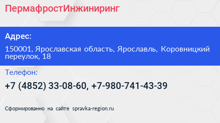 ПермафростИнжиниринг по адресу 150001, Ярославская область, Ярославль, Коровницкий переулок, 18 в дальнейшем Организация, размещена в следующих категориях: