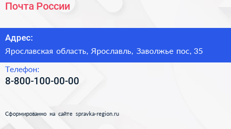 Почта России по адресу Ярославская область, Ярославль, Заволжье пос, 35 в дальнейшем Организация, размещена в следующих категориях:
