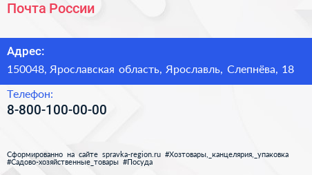 Почта России по адресу 150048, Ярославская область, Ярославль, Слепнёва, 18 в дальнейшем Организация, размещена в следующих категориях: