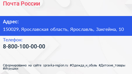 Почта России по адресу 150029, Ярославская область, Ярославль, Закгейма, 10 в дальнейшем Организация, размещена в следующих категориях:
