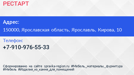 РЕСТАРТ по адресу 150000, Ярославская область, Ярославль, Кирова, 10 в дальнейшем Организация, размещена в следующих категориях: