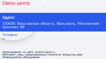 Связь центр по адресу 150030, Ярославская область, Ярославль, Московский проспект, 89 в дальнейшем Организация, размещена в следующих категориях: