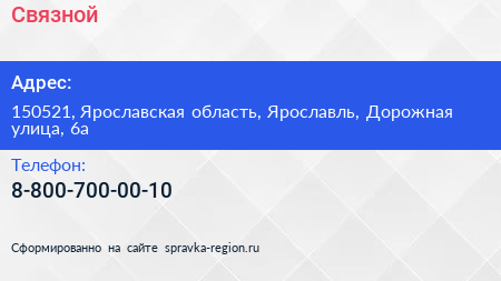 Связной по адресу 150521, Ярославская область, Ярославль, Дорожная улица, 6а в дальнейшем Организация, размещена в следующих категориях:
