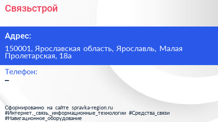 Связьстрой по адресу 150001, Ярославская область, Ярославль, Малая Пролетарская, 18а в дальнейшем Организация, размещена в следующих категориях: