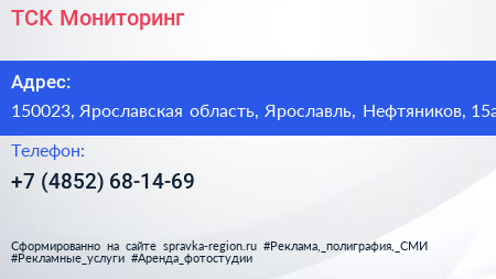 ТСК-Мониторинг по адресу 150023, Ярославская область, Ярославль, Нефтяников, 15а в дальнейшем Организация, размещена в следующих категориях: