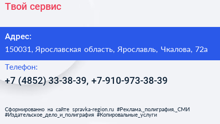 Твой сервис по адресу 150031, Ярославская область, Ярославль, Чкалова, 72а в дальнейшем Организация, размещена в следующих категориях: