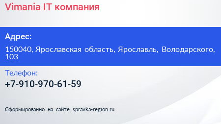 Vimania, IT-компания по адресу 150040, Ярославская область, Ярославль, Володарского, 103 в дальнейшем Организация, размещена в следующих категориях: