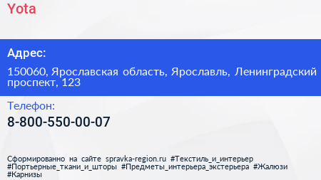 Yota по адресу 150060, Ярославская область, Ярославль, Ленинградский проспект, 123 в дальнейшем Организация, размещена в следующих категориях: