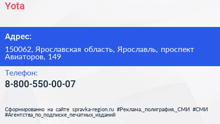 Yota по адресу 150062, Ярославская область, Ярославль, проспект Авиаторов, 149 в дальнейшем Организация, размещена в следующих категориях: