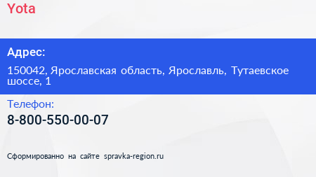 Yota по адресу 150042, Ярославская область, Ярославль, Тутаевское шоссе, 1 в дальнейшем Организация, размещена в следующих категориях: