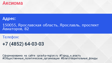 Аксиома по адресу 150055, Ярославская область, Ярославль, проспект Авиаторов, 82 в дальнейшем Организация, размещена в следующих категориях: