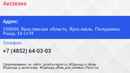 Аксиома по адресу 150044, Ярославская область, Ярославль, Полушкина Роща, 16 ст74 в дальнейшем Организация, размещена в следующих категориях: