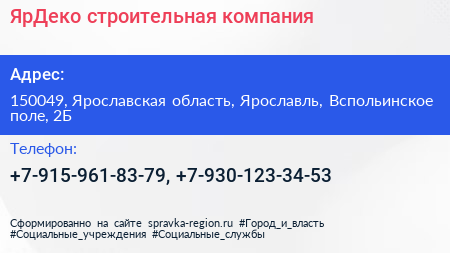 ЯрДеко, строительная компания по адресу 150049, Ярославская область, Ярославль, Вспольинское поле, 2Б в дальнейшем Организация, размещена в следующих категориях: