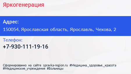 Яркогенерация по адресу 150054, Ярославская область, Ярославль, Чехова, 2 в дальнейшем Организация, размещена в следующих категориях: