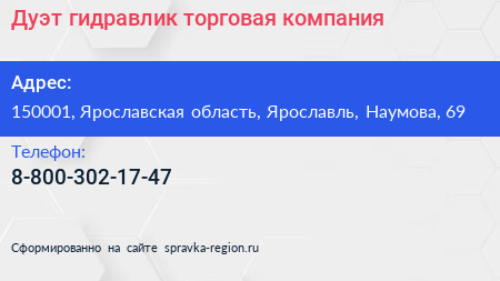 Дуэт гидравлик, торговая компания по адресу 150001, Ярославская область, Ярославль, Наумова, 69 в дальнейшем Организация, размещена в следующих категориях: