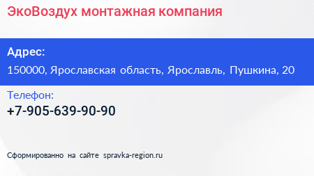 ЭкоВоздух, монтажная компания по адресу 150000, Ярославская область, Ярославль, Пушкина, 20 в дальнейшем Организация, размещена в следующих категориях: