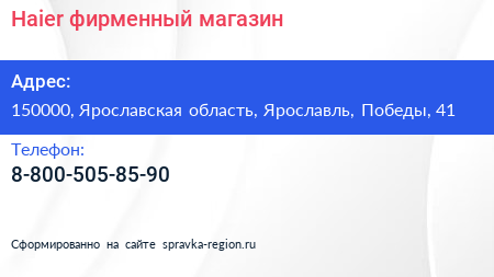 Haier, фирменный магазин по адресу 150000, Ярославская область, Ярославль, Победы, 41 в дальнейшем Организация, размещена в следующих категориях: