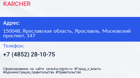 KARCHER по адресу 150048, Ярославская область, Ярославль, Московский проспект, 147 в дальнейшем Организация, размещена в следующих категориях: