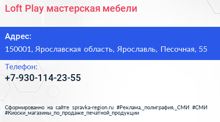 Loft Play, мастерская мебели по адресу 150001, Ярославская область, Ярославль, Песочная, 55 в дальнейшем Организация, размещена в следующих категориях: