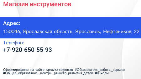 Магазин инструментов по адресу 150046, Ярославская область, Ярославль, Нефтяников, 22 в дальнейшем Организация, размещена в следующих категориях: