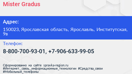 Mister Gradus по адресу 150023, Ярославская область, Ярославль, Институтская, 9в в дальнейшем Организация, размещена в следующих категориях: