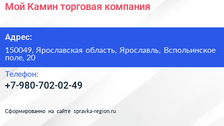 Мой Камин, торговая компания по адресу 150049, Ярославская область, Ярославль, Вспольинское поле, 20 в дальнейшем Организация, размещена в следующих категориях: